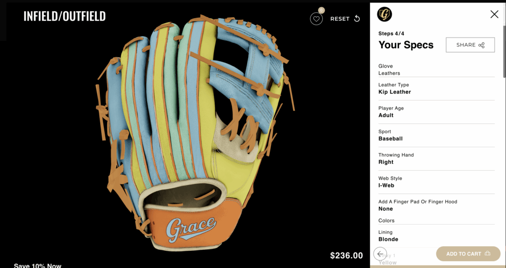 Grace Glove Company is a premium baseball glove brand offering fully customizable gloves built for athletes who care about fit, quality, and design. To match its craftsmanship online, Grace Glove needed a faster, more realistic, and more intuitive 3D customization experience.
